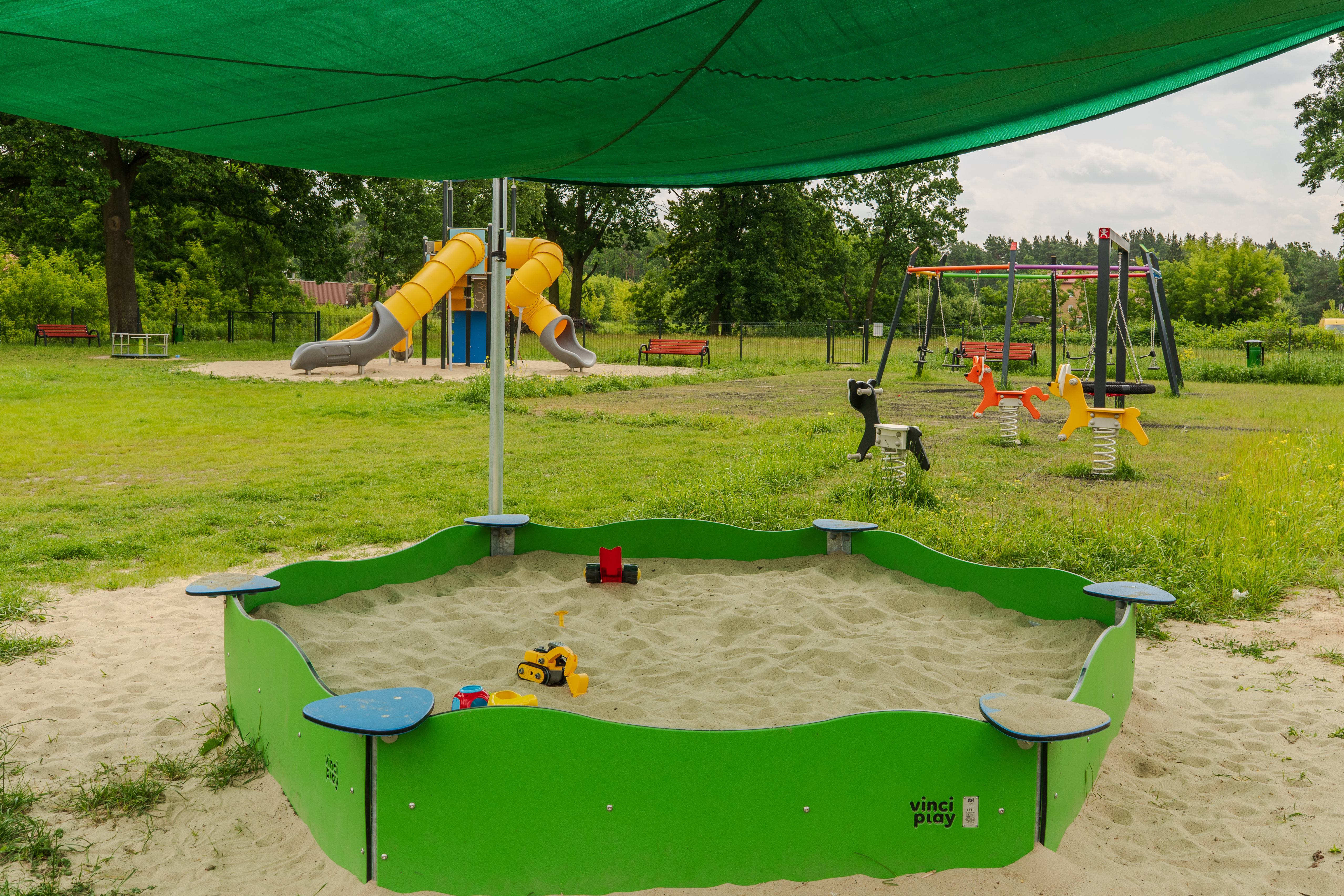 Nie mogło też zabraknąć piaskownicy – to jedno z tych miejsc, w których dzieci potrafią spędzać długie godziny na kopaniu, przesypywaniu i budowaniu. Została wyposażona w zadaszenie, by chronić najmłodszych przed słońcem – nawet w cieplejsze dni można się tu bawić komfortowo i bezpiecznie.