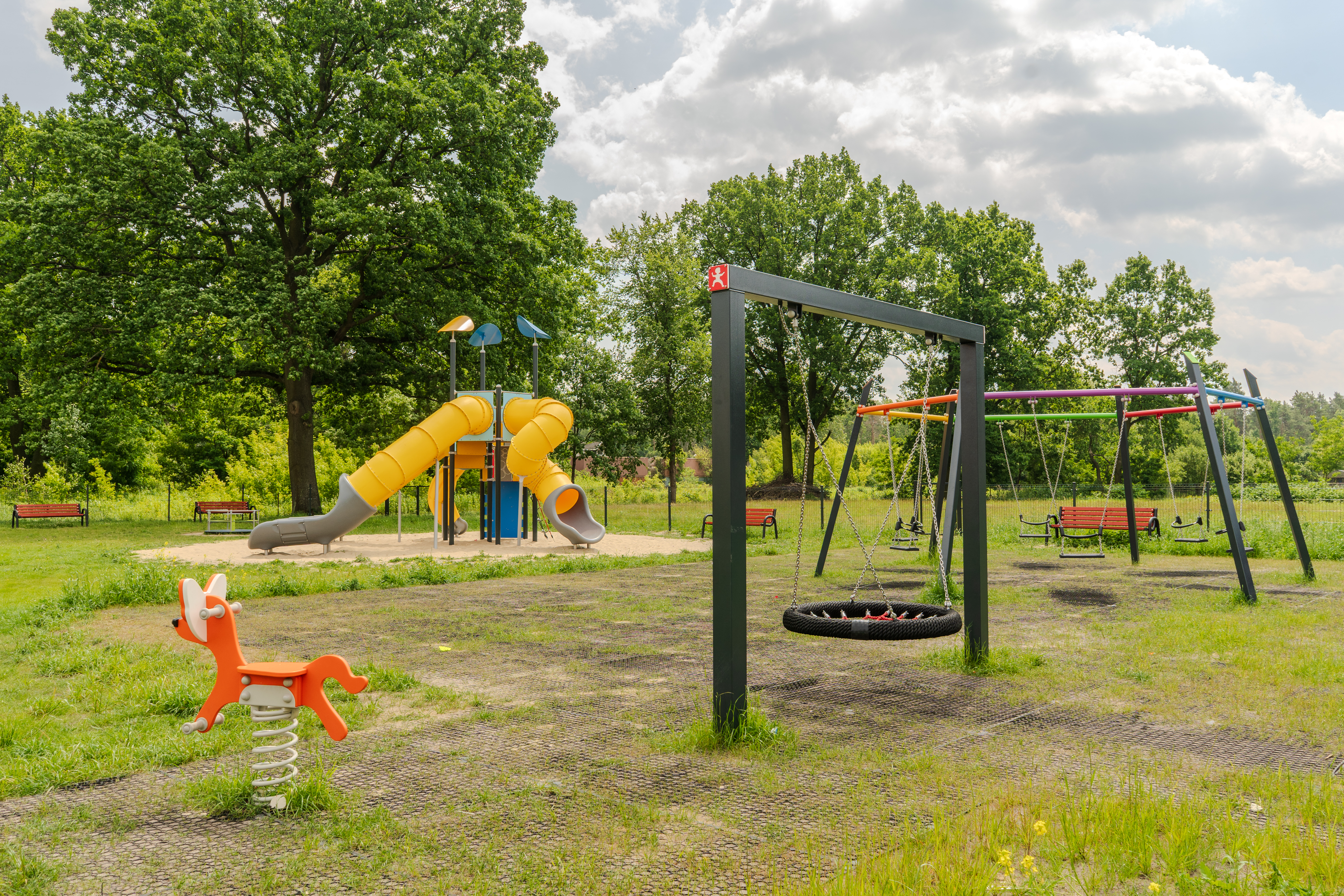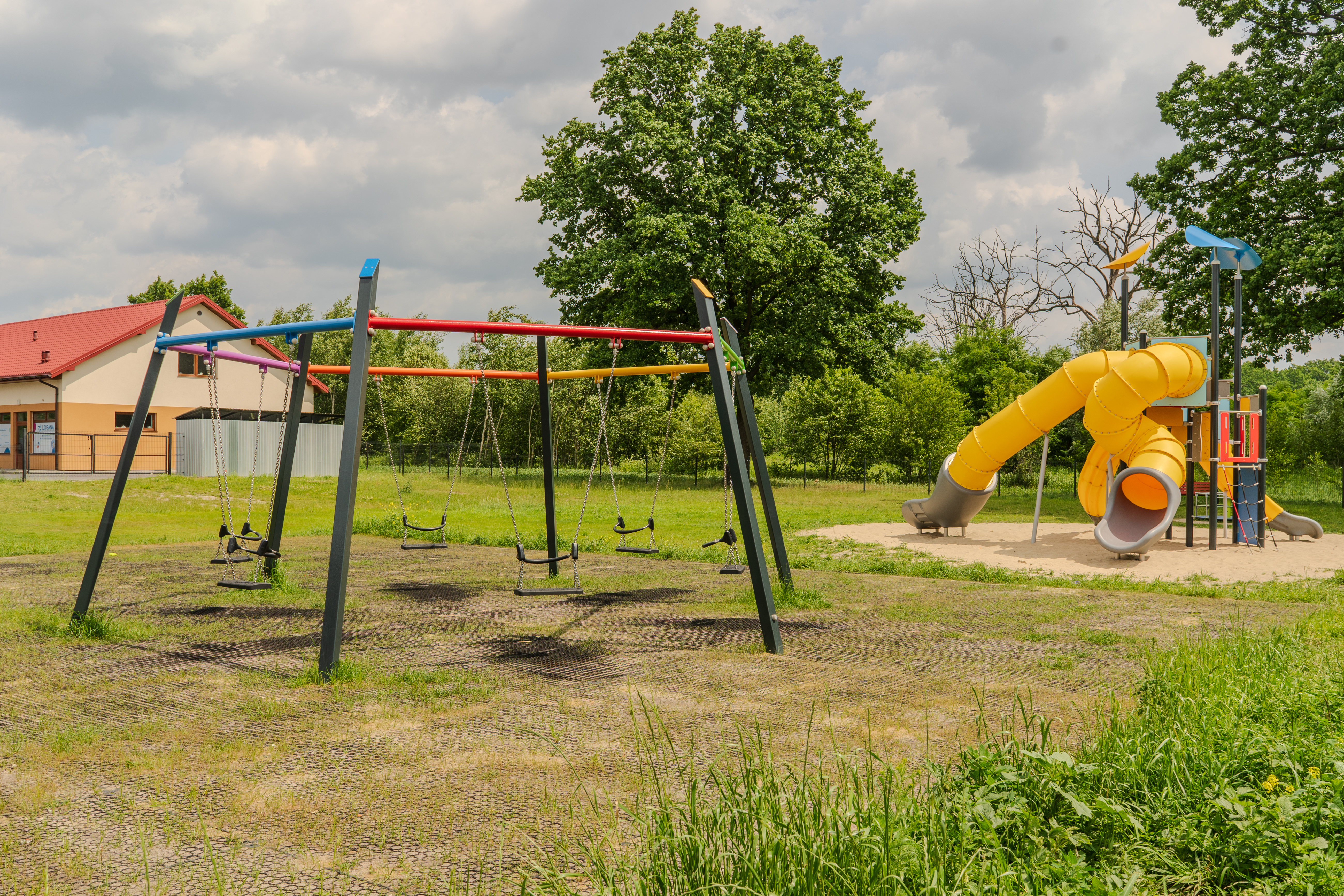 Obok pojawiły się huśtawki – kolejna obowiązkowa atrakcja, bez której trudno wyobrazić sobie plac zabaw. Jest tam zarówno huśtawka klasyczna, dobrze znana każdemu z dzieciństwa, ale też sześcioramienna, która umożliwia wspólną zabawę większej grupie dzieci. Dużym zainteresowaniem cieszy się też huśtawka „bocianie gniazdo” – szeroka, zawieszona na linach, wygodna zarówno dla młodszych, jak i starszych dzieci.