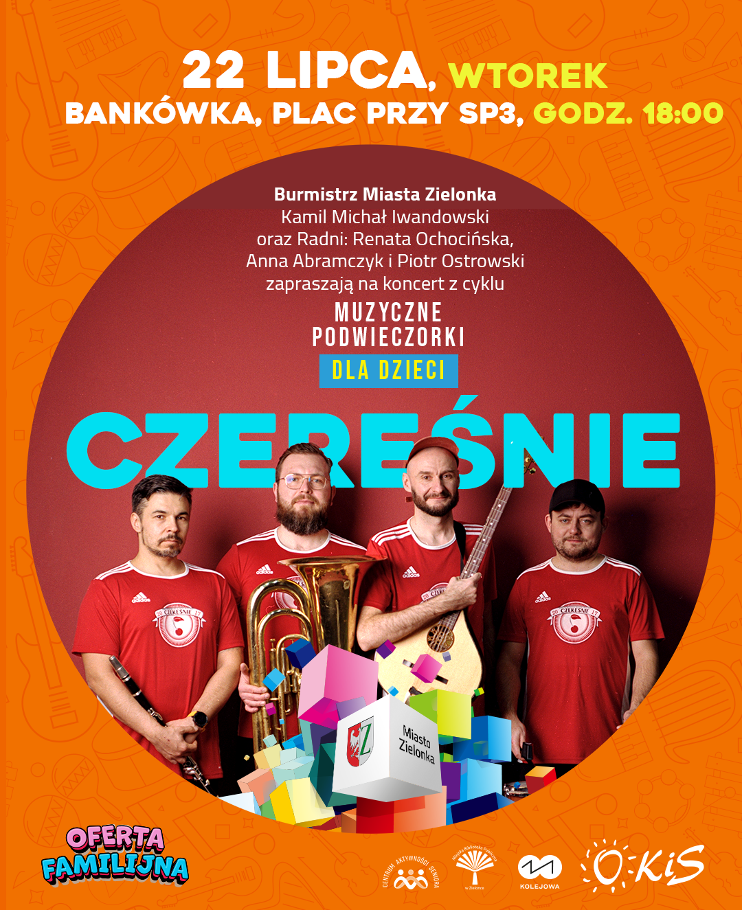 Nasz muzyczny wieczór rozpoczniemy od spotkania z zespołem Czereśnie – dobrze znanym i lubianym przez najmłodszych, ale z muzyką, którą z przyjemnością słuchają też dorośli. Ich koncerty to nie tylko świetna muzyka na żywo, ale prawdziwa opowieść o codziennym świecie widzianym oczami dziecka. Już we wtorek zespół zabierze nas do głośnego i pędzącego miasta – będziemy towarzyszyć kurierowi, zajrzymy na budowę i wyruszamy na wakacje. Jedno jest pewne – nudy nie będzie! Czereśnie grają razem z publicznością – zapraszają do śpiewania i wspólnej zabawy.