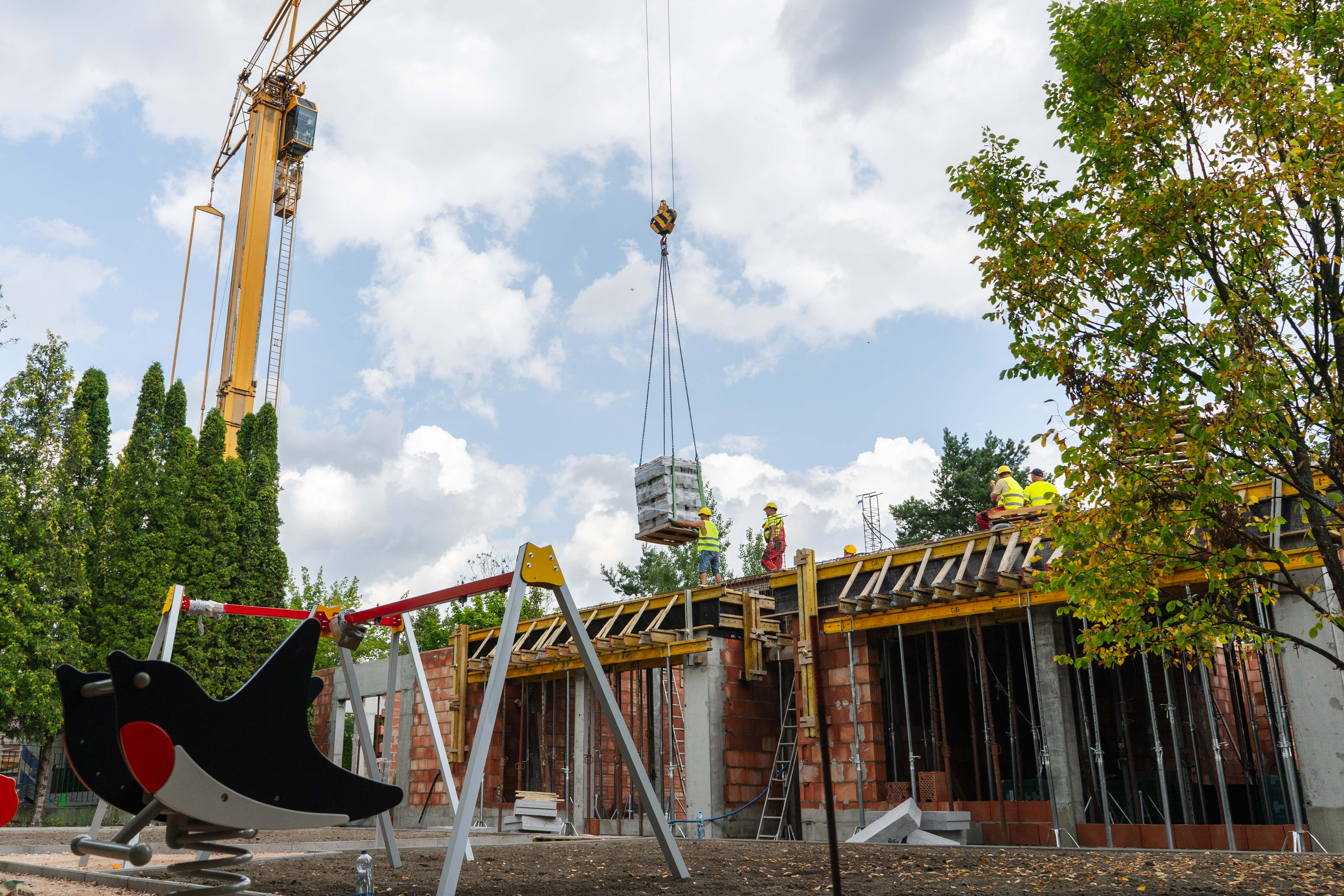 Na terenie budowy miejskiego żłobka widać kolejne efekty prac. Zakończył się jeden z ważniejszych etapów, czyli wznoszenie ścian konstrukcyjnych. Następnie wykonawca przystąpił do prac związanych z przygotowywaniem stropu. Równolegle wiele dzieje się wokół samego budynku – trwa układanie nawierzchni oraz montaż urządzeń na nowym placu zabaw.