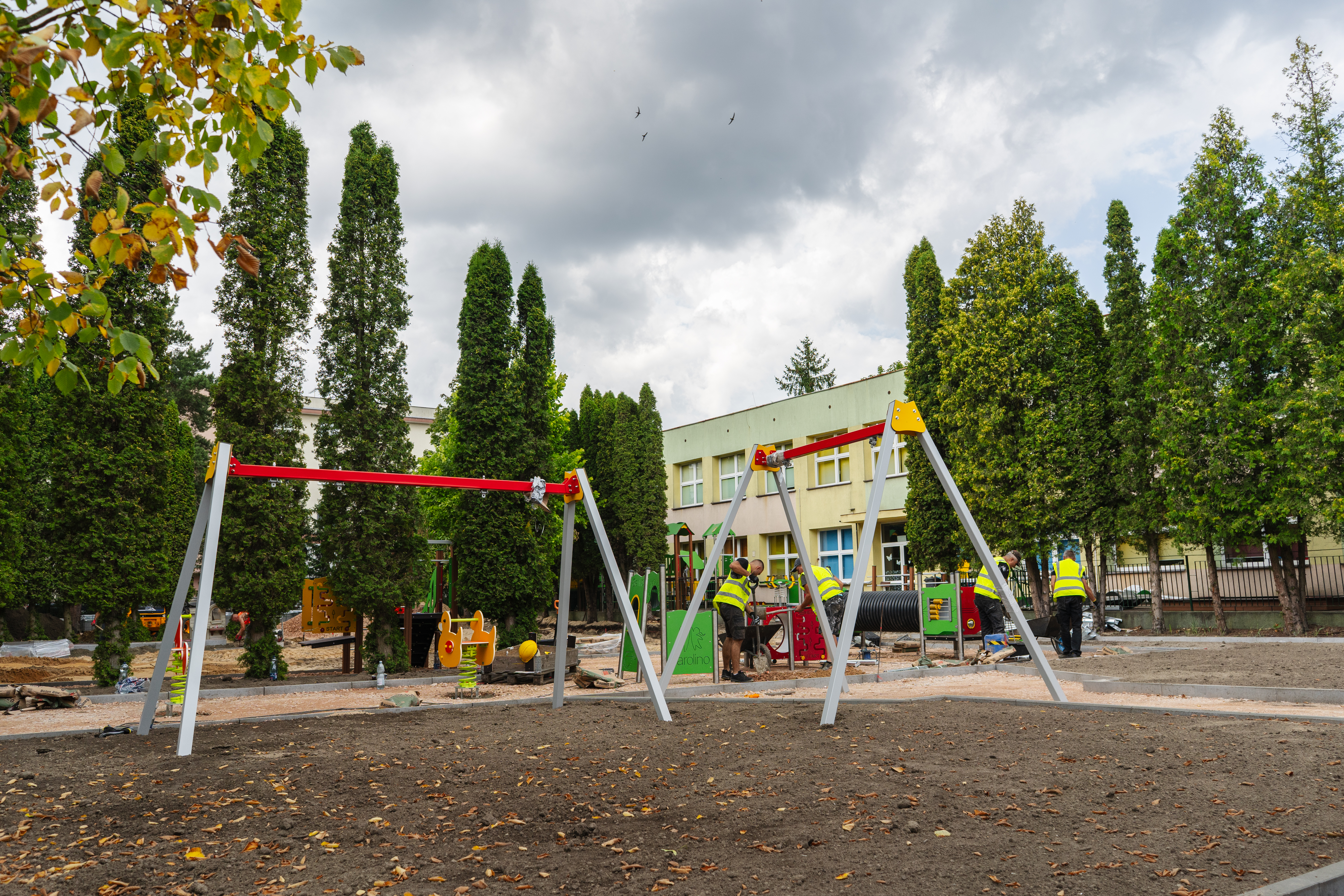 Równolegle prace toczą się także wokół budynku. Z terenu przyszłego placu zabaw wywieziono nadmiar gruntu i przygotowano podłoże pod nową, bezpieczną nawierzchnię. Wykonawca przystąpił również do montażu urządzeń, które wkrótce stworzą kolorową i komfortową przestrzeń do zabawy dla najmłodszych mieszkańców.