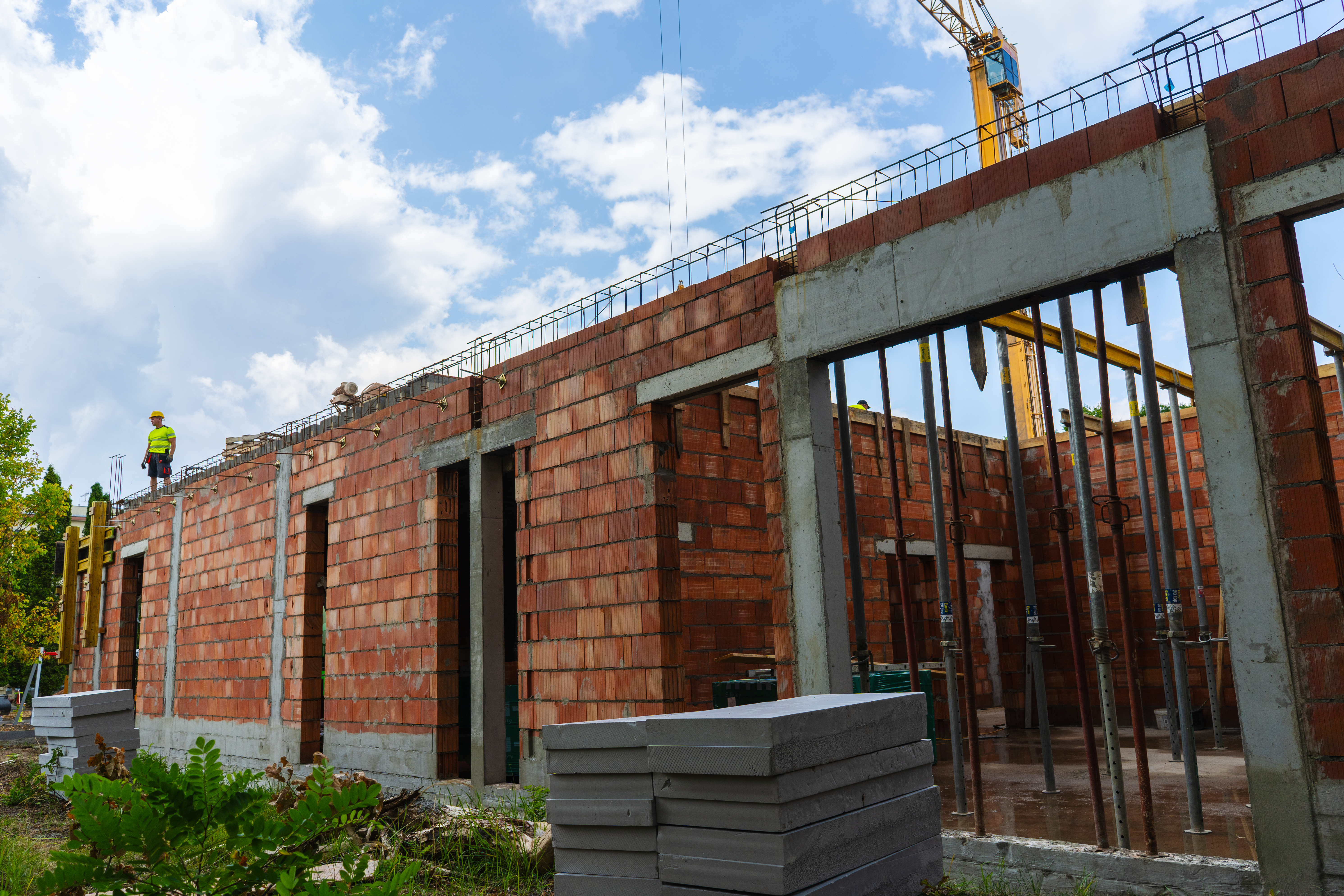 Wraz z zakończeniem wznoszenia ścian konstrukcyjnych wyraźnie zarysował się kształt przyszłego budynku. To ważny etap inwestycji, który umożliwił przejście do kolejnych prac. Obecnie trwa zbrojenie stropu, czyli układanie stalowych prętów wzmacniających konstrukcję. W następnej kolejności całość zostanie zalana betonem. Strop stanowi istotny element nośny budynku – odpowiada za jego stabilność i pozwala na dalsze prace wewnątrz obiektu.
