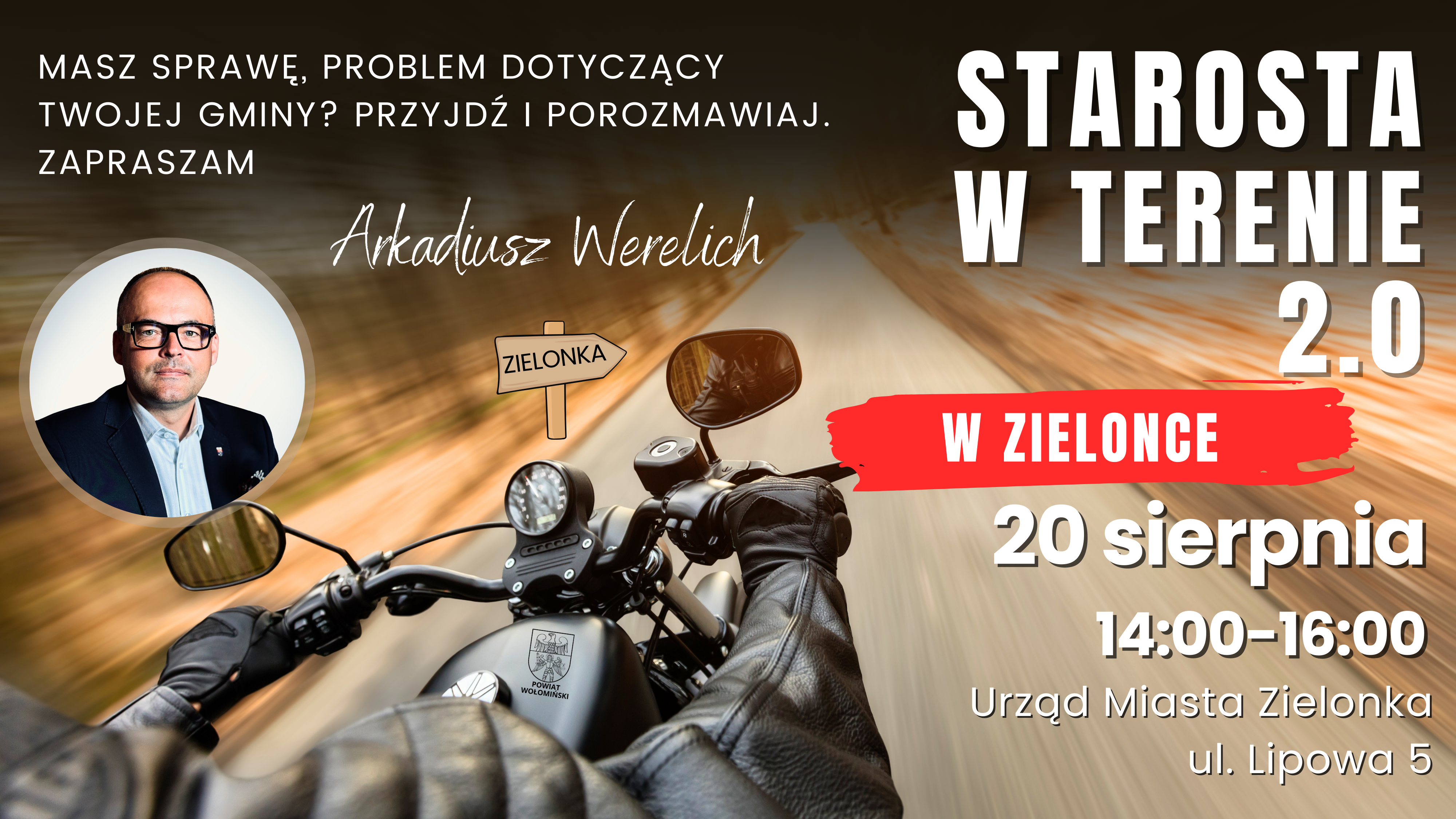 Starosta Wołomiński Arkadiusz Werelich zaprasza mieszkańców Zielonki w środę, 20 sierpnia na spotkanie w ramach inicjatywy "Starosta w terenie 2.0". Spotkanie będzie okazją do rozmowy o sprawach lokalnych, a także zadania pytań dotyczących działalności Powiatu.