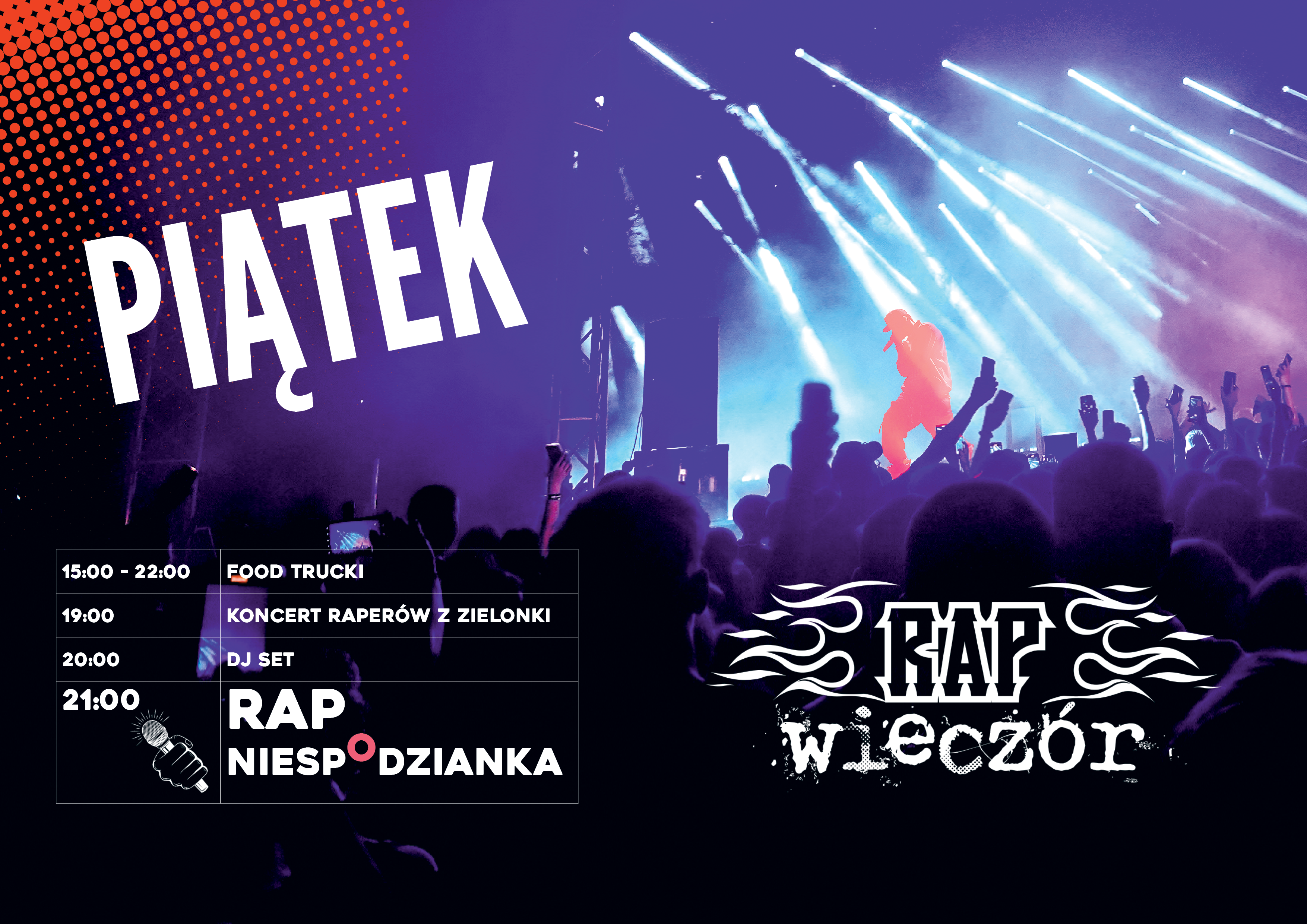 Najpierw usłyszymy lokalnych raperów z Zielonki, którzy otworzą nasz RAP Wieczór i zadbają o wprowadzenie nas w odpowiedni klimat. Później stery przejmie DJ, a o 21:00 przyjdzie czas na finał wieczoru, czyli występ naszej RAP Niespodzianki. Jeszcze nie zdradzamy kto to będzie, ale możemy obiecać, że na scenie pojawi się artysta z absolutnej czołówki polskiego rapu. Więcej szczegółów lada moment, więc trzymajcie rękę na pulsie i obserwujcie naszego Facebooka i stronę internetową.