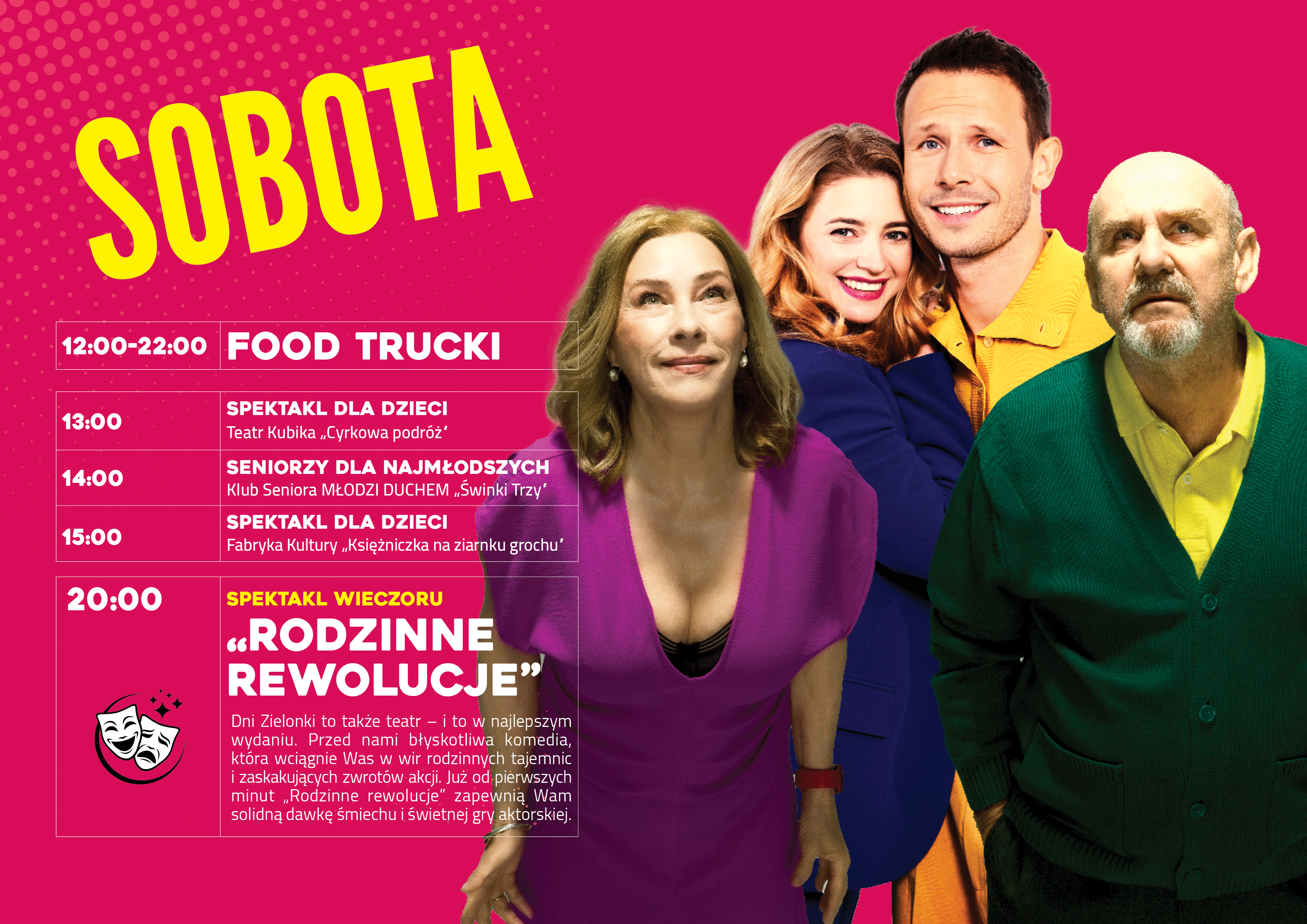 Zwieńczeniem sobotniego dnia z teatrem będzie błyskotliwa komedia „Rodzinne rewolucje”. O 20:00 na scenie pojawią się znakomici aktorzy – Małgorzata Potocka, Karolina Bacia, Sławomir Orzechowski, Mateusz Banasiuk i Michał Rolnicki. Artyści wciągną nas w wir rodzinnych tajemnic i zaskakujących zwrotów akcji. To będzie spektakl, który rozbawi nas już od pierwszych minut i dostarczy mnóstwo pozytywnych emocji aż do ostatniej sceny.