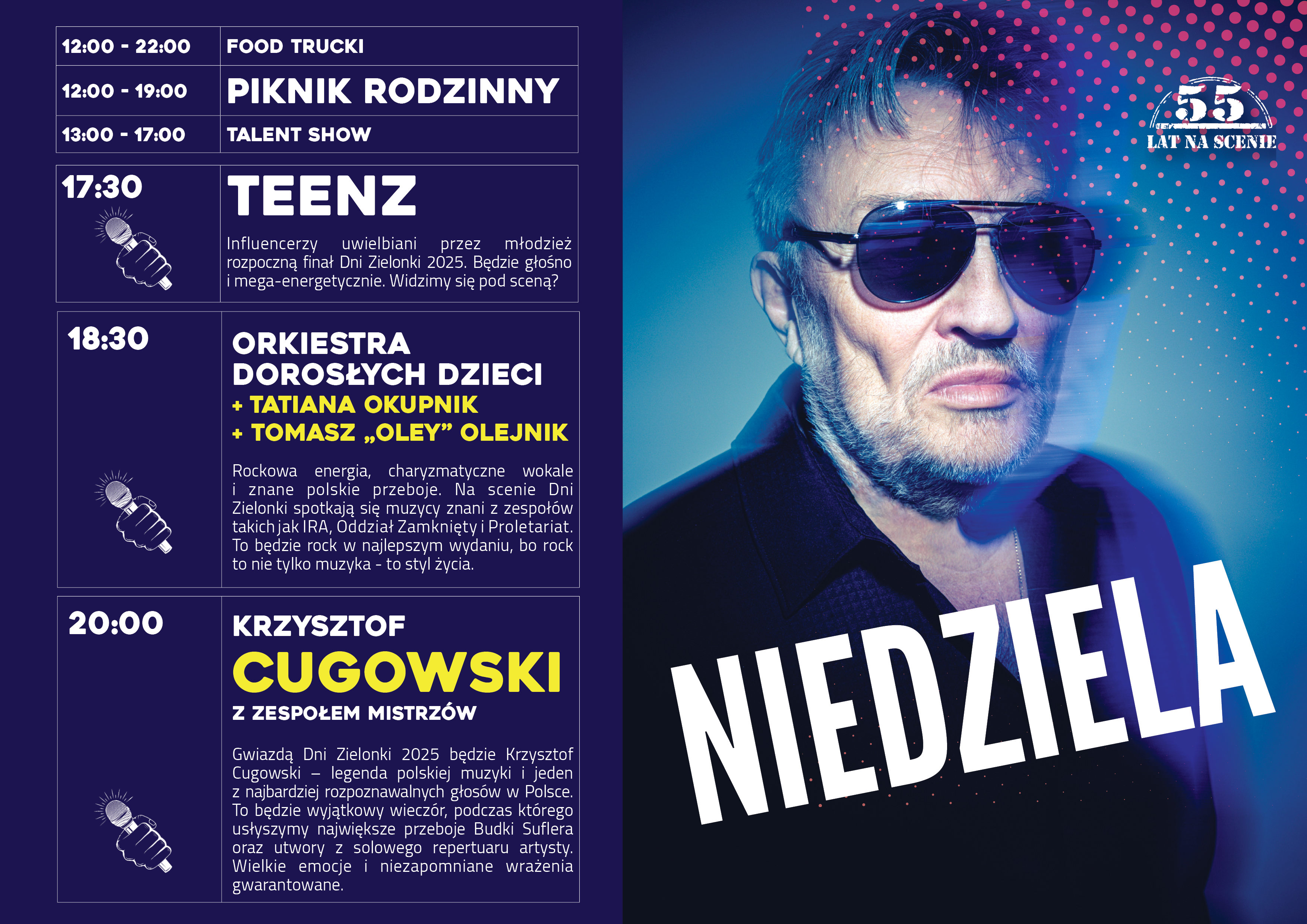 Dni Zielonki 2025 zwieńczy występ gwiazdy wieczoru, którą w tym roku będzie Krzysztof Cugowski. Na scenie artysta pojawi się razem z Zespołem Mistrzów, a w programie usłyszymy zarówno największe przeboje Budki Suflera, jak i utwory z jego solowego repertuaru. Wielkie emocje i niezapomniane wrażenia gwarantowane.
