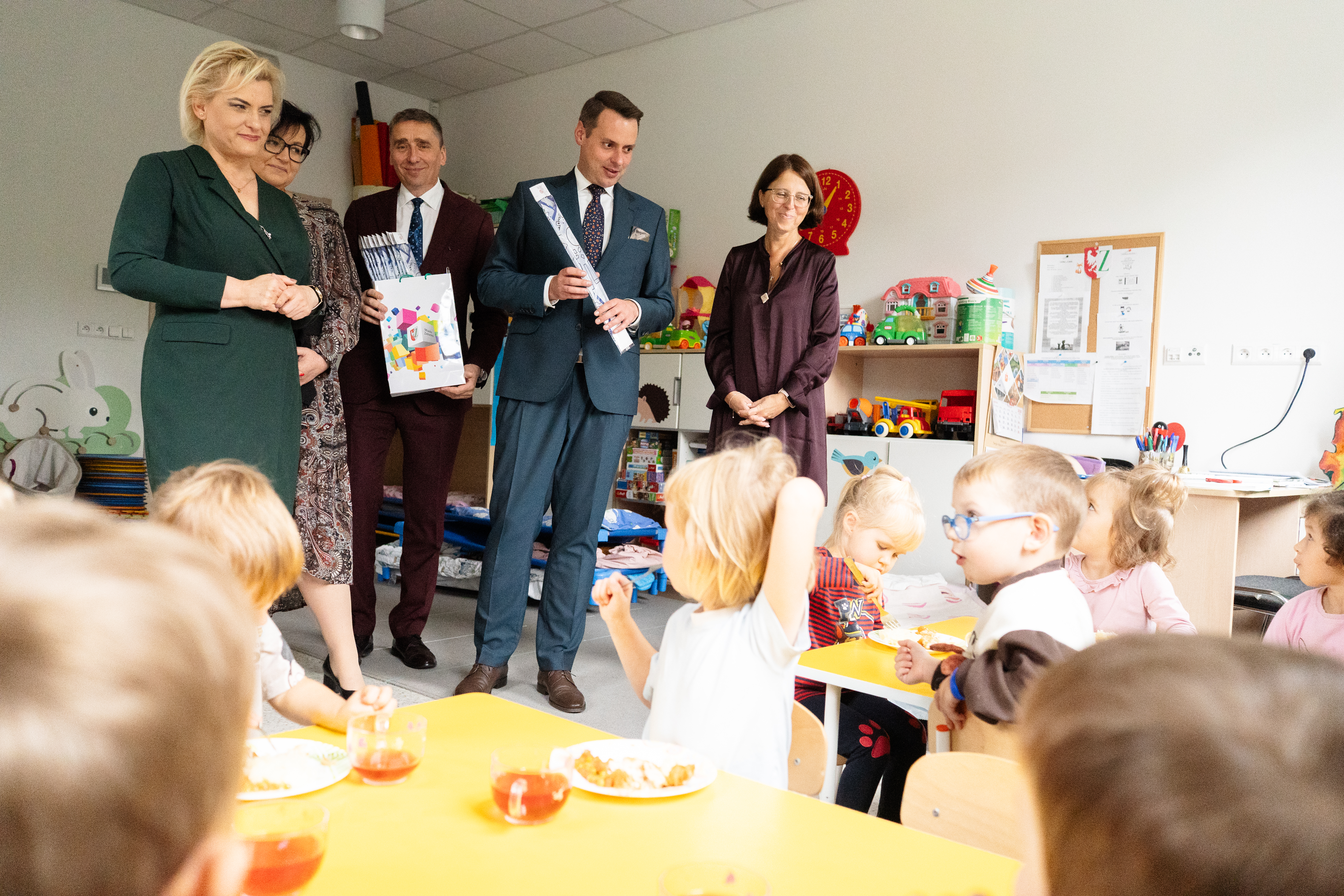 Był to czas na chwilę rozmowy, złożenie życzeń z okazji tego wyjątkowego święta i wspólne spędzenie kilku miłych chwil. Dzieci z entuzjazmem witały gości, przybijały „piątki” z Burmistrzem, zadawały pytania i dzieliły się swoimi przeżyciami.