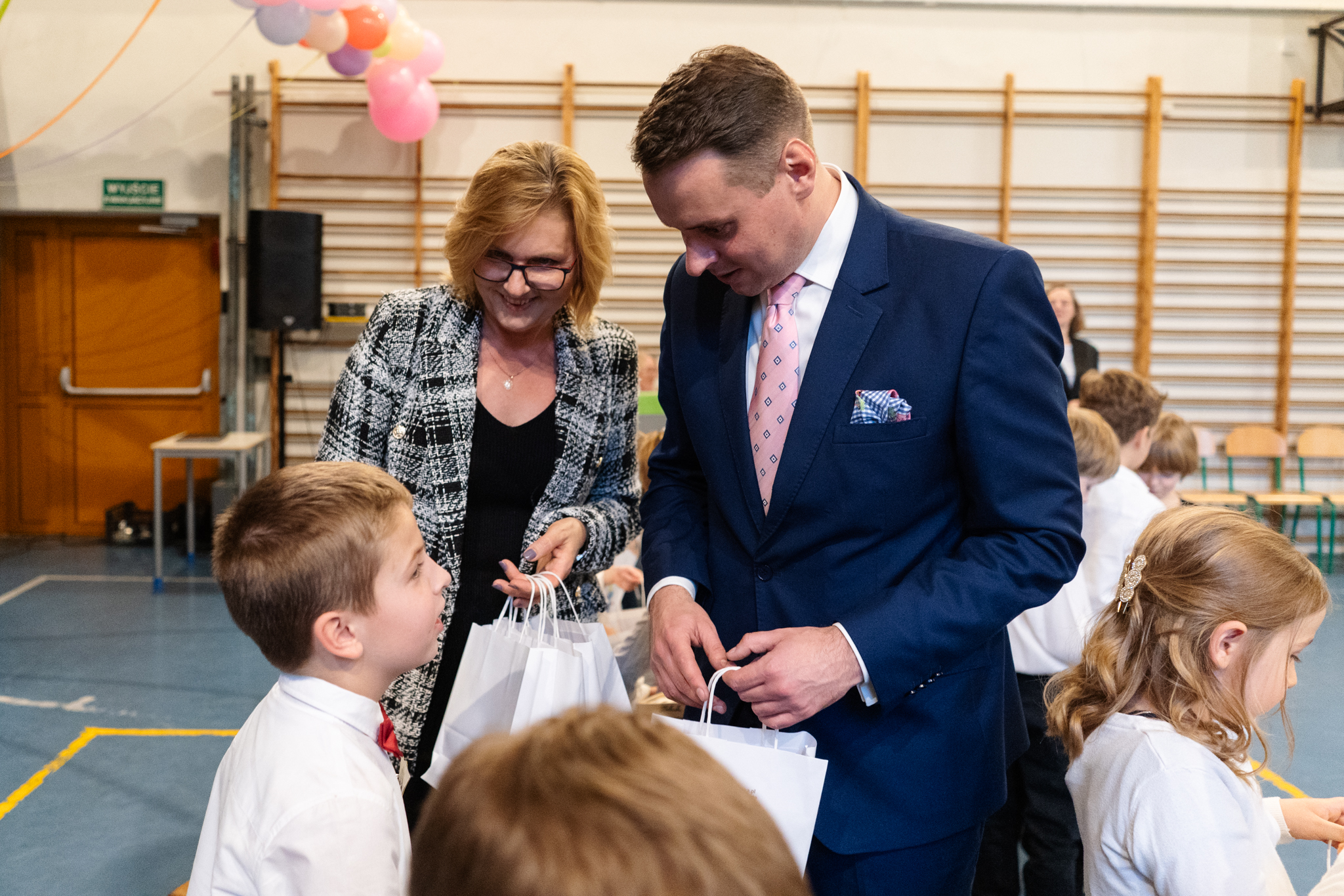 Z okazji tego ważnego dnia na pierwszoklasistów czekały także drobne upominki, które dzieciom wręczyli Burmistrz, Skarbnik oraz Radni. Burmistrz Kamil Michał Iwandowski pogratulował uczniom i życzył im, aby każdy dzień spędzony w Szkole Podstawowej nr 3 przynosił same pozytywne chwile, budował wspaniałe wspomnienia i był początkiem przyjaźni, które zostaną z nimi na długie lata.