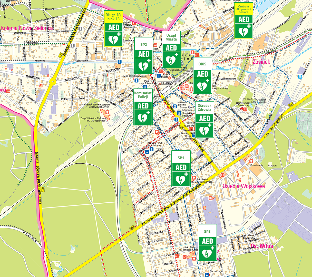 Defibrylatory w Zielonce znajdują się obecnie w: Szkole Podstawowej nr 1, Szkole Podstawowej nr 2 i Szkole Podstawowej nr 3, Ośrodku Kultury i Sportu, Urzędzie Miasta, Komisariacie Policji, Ośrodku Zdrowia przy ul. Mickiewicza, Centrum Aktywności Seniora, obok sklepu spożywczego przy ul. Długiej 18 (blok 13).