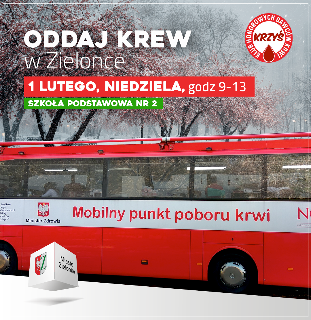 Jest niezastąpiona, nie da się jej wytworzyć, a jej wartość mierzy się ludzkim życiem. Krew. W niedzielę, 1 lutego, w Zielonce odbędzie się pierwsza w tym roku zbiórka krwi organizowana przez Klub Honorowych Dawców Krwi „Krzyś”. Zdrowe osoby dorosłe będą mogły oddać krew w mobilnym punkcie krwiodawstwa, który stanie przed budynkiem Szkoły Podstawowej nr 2 przy ul. Powstańców 3.