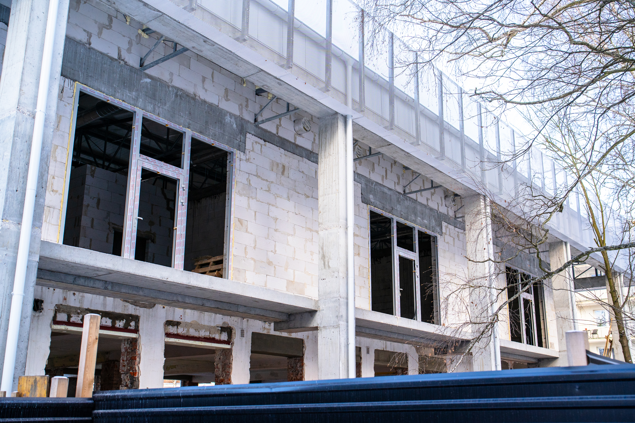 Modernizacja obejmuje także gruntowne zmiany w istniejącej, starszej, parterowej części obiektu. Obecnie wykonano nową posadzkę wraz z instalacjami podposadzkowymi. Jednocześnie wykute zostały otwory pod nowe, większe okna i drzwi na parterze budynku. Przed nami montaż nowej stolarki aluminiowej. Trwają prace murarskie związane z nowym układem funkcjonalnym parteru.