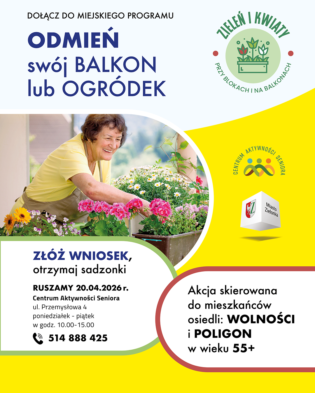 Wiosna to najlepszy moment, by wprowadzić do codziennego otoczenia więcej koloru, świeżości i radości. Z taką myślą Centrum Aktywności Seniora zaprasza Państwa do udziału w kolejnej edycji akcji „Zieleń i kwiaty przy blokach i na balkonach”. Po ubiegłorocznym, bardzo dobrze przyjętym pilotażu na osiedlu Wolności, w tym roku do programu dołączają także seniorzy z osiedla Poligon.