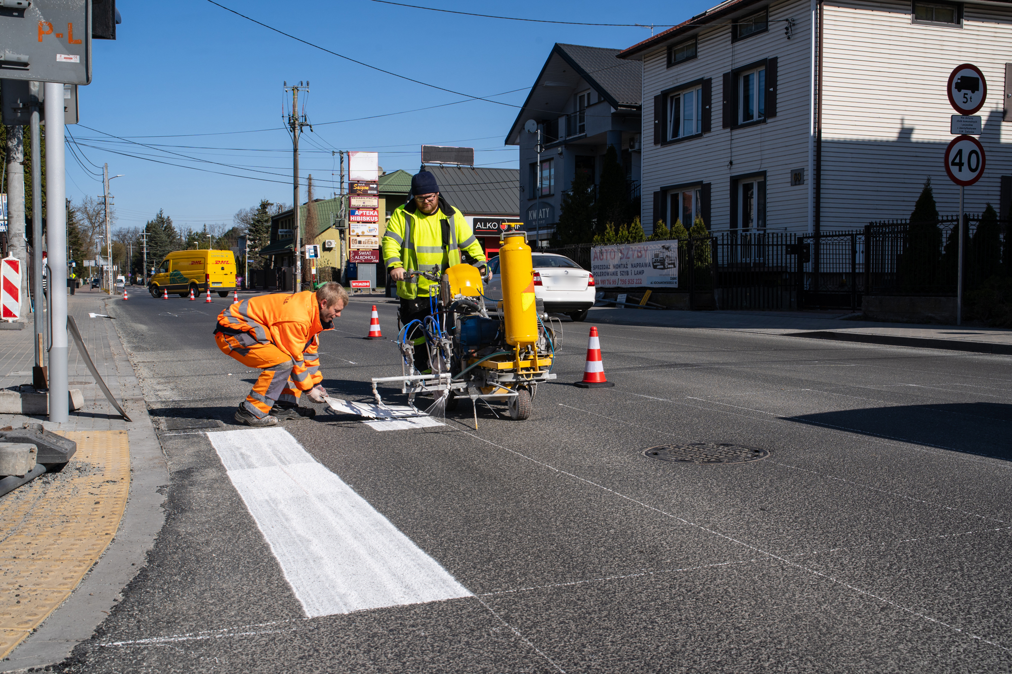 Po pracach bitumicznych drogowcy rozpoczęli malowanie tymczasowych pasów na jezdni. To rozwiązanie przejściowe, które ma uporządkować ruch i zapewnić bezpieczeństwo do czasu wykonania oznakowania docelowego.