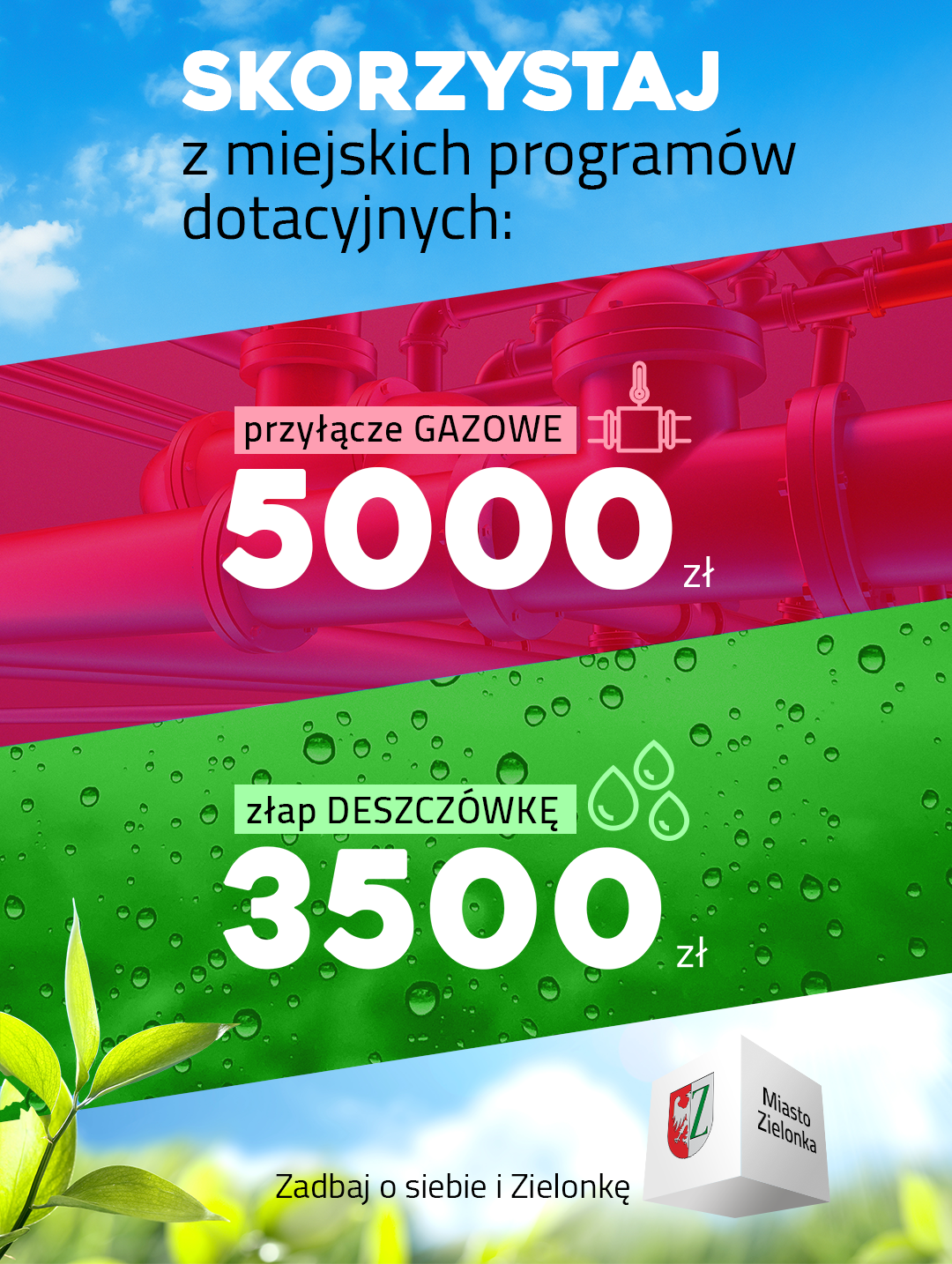 Miasto Zielonka prowadzi obecnie nabór w ramach dwóch programów dotacyjnych, które mogą obniżyć Państwa koszty planowanych prac. Pierwszy z nich dotyczy zakupu i montażu instalacji służących do gromadzenia oraz wykorzystania wód opadowych. Drugi obejmuje wykonanie przyłącza gazowego i instalacji gazowej w istniejących budynkach lub lokalach.