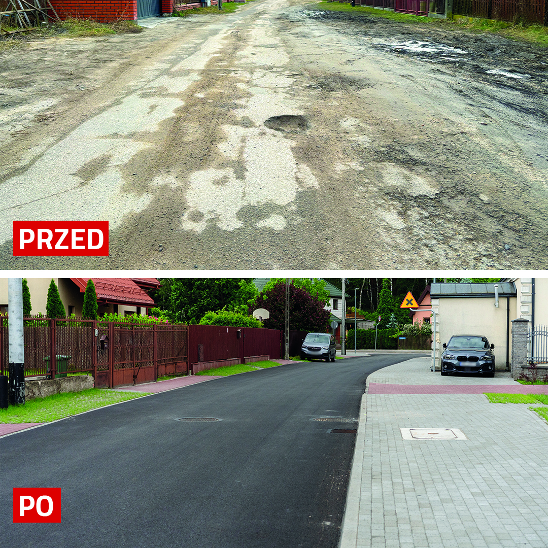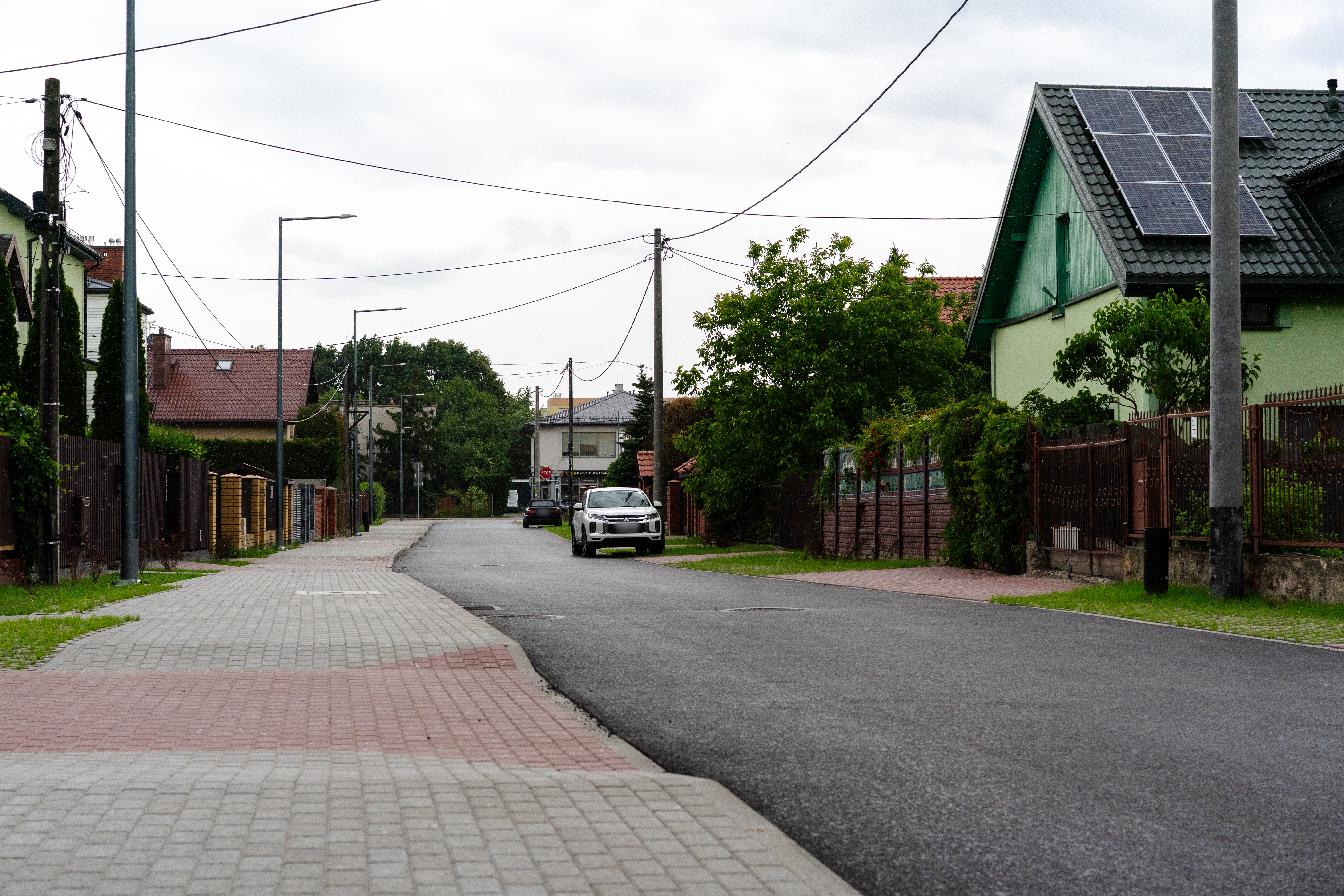 Ulica przeszła prawdziwą metamorfozę. Starą nawierzchnię, która po intensywnych opadach stawała się trudna do pokonania, zastąpił nowy asfalt na trwałej podbudowie. Piesi zyskali bezpieczny i wygodny chodnik, a właściciele posesji – estetyczne i solidne zjazdy.