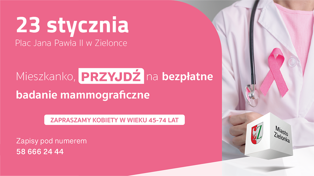 Nowy rok to doskonały moment, by zadbać o swoje zdrowie. Jeśli jesteś kobietą w wieku od 45 do 74 lat możesz bezpłatnie i bez skierowania wykonać mammografię piersi. Rak piersi jest najczęściej diagnozowanym nowotworem złośliwym u kobiet. Początkowo nie daje żadnych objawów. Wcześnie wykryty – jest jednak uleczalny. Dlatego tak ważne są regularne badania. 23 stycznia na Placu Jana Pawła II stanie mobilna pracownia mammograficzna Lux Med, która przyjmie pacjentki od godz. 8:30 do 16:00. Nie zwlekaj i zarejestruj się na badanie już teraz.