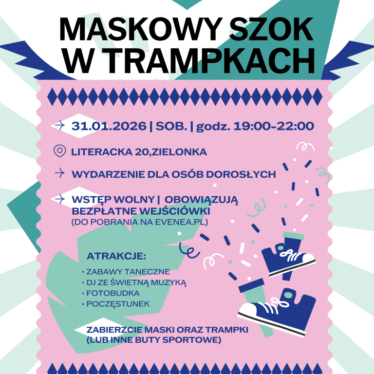 W sobotni wieczór zapraszamy na Maskowy szok w trampkach - wspólną zabawę, która będzie okazją do hucznego uczczenia trwającego karnawału. Zabierzcie trampki (lub inne wygodne buty) oraz maski - symbol karnawału i wspólnie z nami rozpocznijcie nowy rok tanecznym krokiem. Na Literackiej będzie czekało na Was mnóstwo atrakcji, w tym DJ ze świetną muzyką, gry i zabawy taneczne, fotobudka oraz poczęstunek.