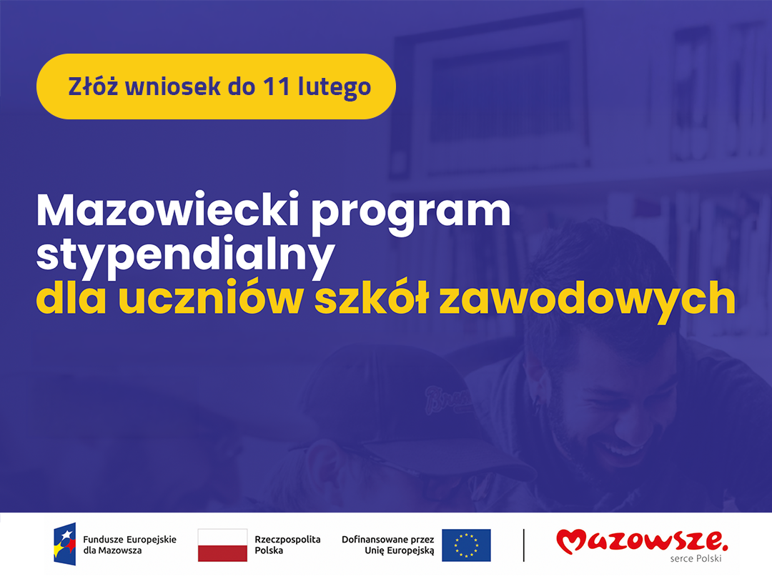 Uczeń powiatu wołomińskiego stypendium może uzyskać w ramach projektu "Mazowieckiprogram stypendialny dla uczniów szkół zawodowych 2025/2026 – Region Warszawski Stołeczny” w ramach programu Fundusze Europejskie dla Mazowsza 2021–2027.