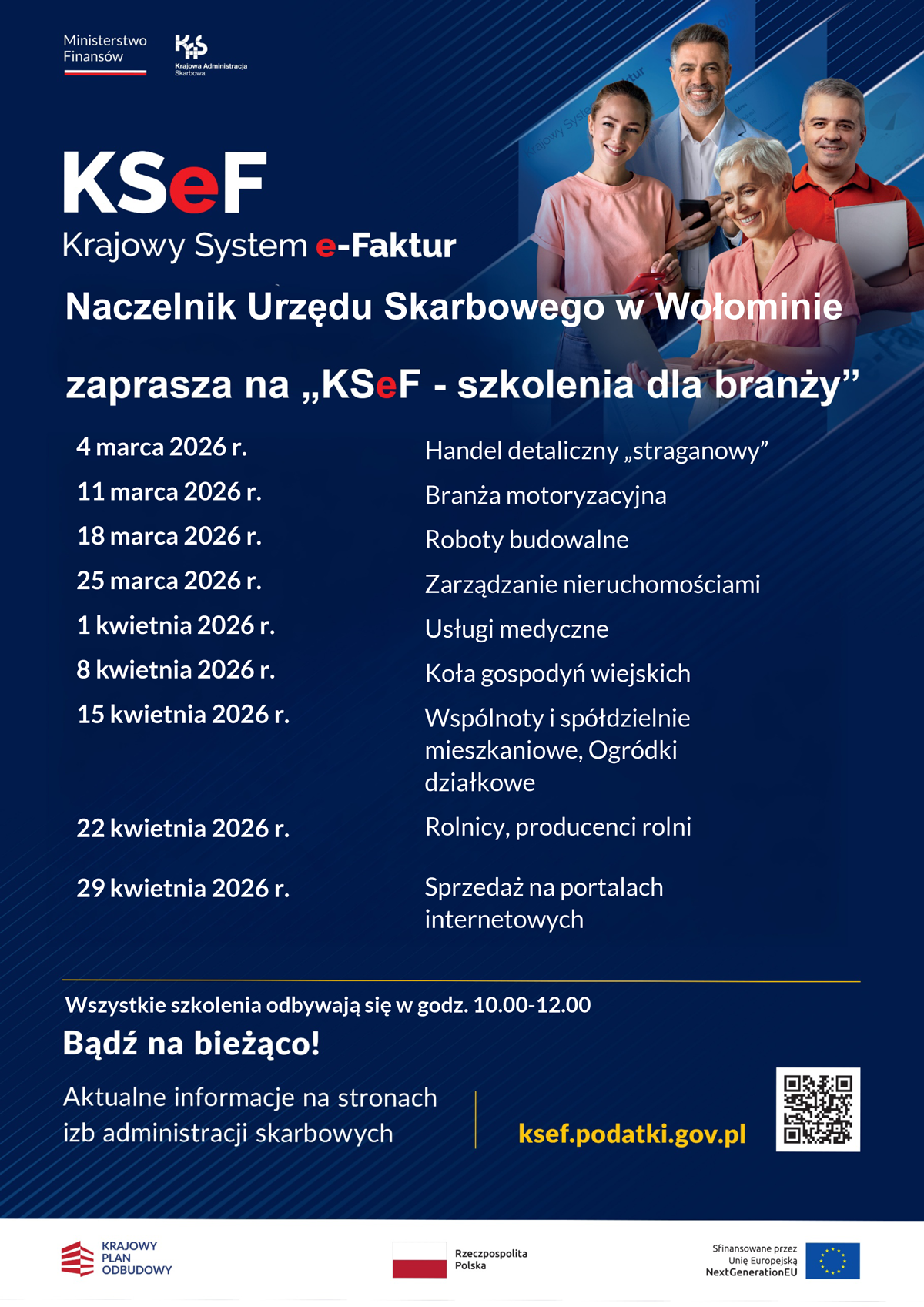 Naczelnik Urzędu Skarbowego w Wołominie zaprasza na cykl spotkań „KSeF – szkolenia dla branży”. To propozycja dla przedsiębiorców, przedstawicieli różnych sektorów gospodarki, a także podmiotów i organizacji, które chcą lepiej przygotować się do korzystania z Krajowego Systemu e-Faktur.