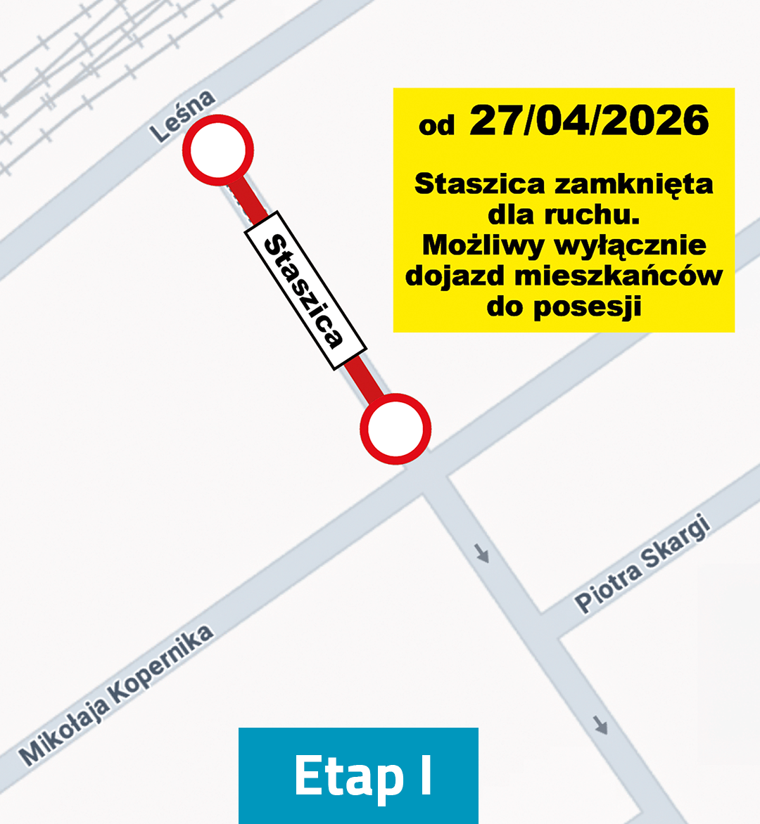 Od poniedziałku 27 kwietnia modernizowany odcinek ul. Staszica zostanie wyłączony z ruchu. Utrzymany zostanie wyłącznie dojazd do posesji bezpośrednio położonych przy przebudowywanym fragmencie ulicy.