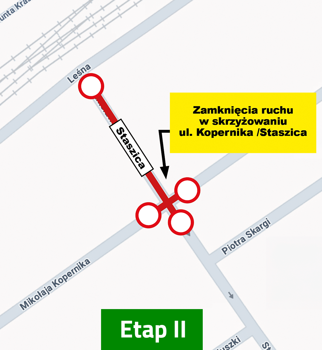 Przez cały okres budowy drożne pozostanie skrzyżowanie z ul. Leśną. Skrzyżowanie z ul. Kopernika będzie przejezdne w pierwszym etapie prac, natomiast w drugim etapie zostanie czasowo wyłączone z ruchu z uwagi na konieczność przeprowadzenia robót w tym rejonie.