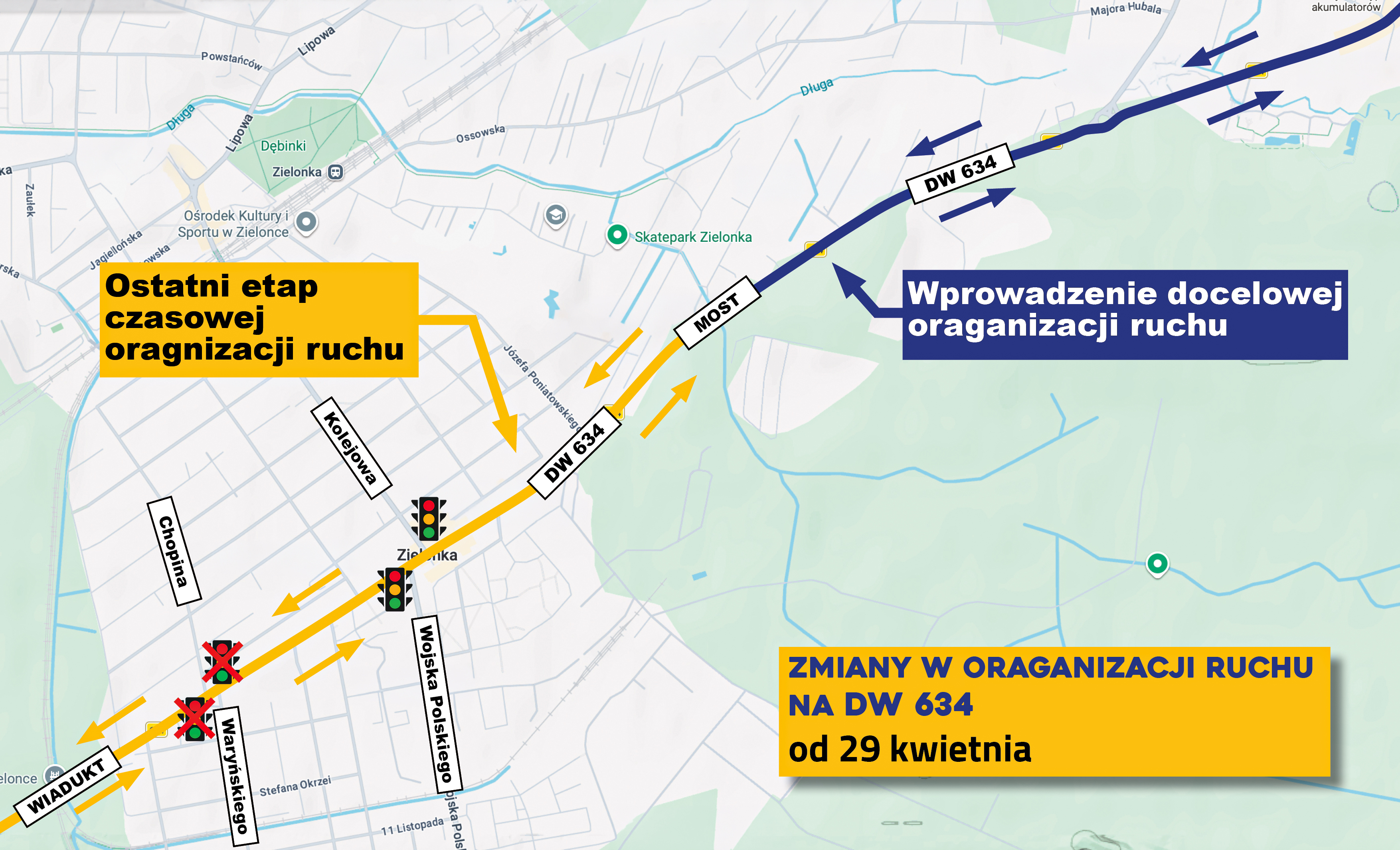 Bez zmian pozostaje natomiast skrzyżowanie DW634 z ulicami Chopina i Waryńskiego — tam sygnalizacja świetlna nadal będzie wyłączona.